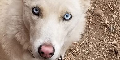 We seem to be having a run on all white Huskies! Even though he looks a lot like our friend GHOST, KALLIK is a little more stout and rough around the edges. Such is the result of a less privileged recent past! KALLIK (pronounced KAH-LEEK) is an Inuit name meaning Lightening. This all-white, long-haired Siberian Husky is totally boy and a lot of male energy. Unfortunately for him, he was never trained as an (even younger) puppy and is pretty much a blank slate except for coming when called for food and now, crate trained. He is only one and a half years old and not a bad kid- just exuberant and unruly. All it’s going to take is for someone who has patience and a knack for that kind of thing to bring him around to being their BFF. He is loyal, curious, and came to us a little hand shy so we can only imagine that his “education” prior to Thunder Puppy wasn’t ‘positive reinforcement.